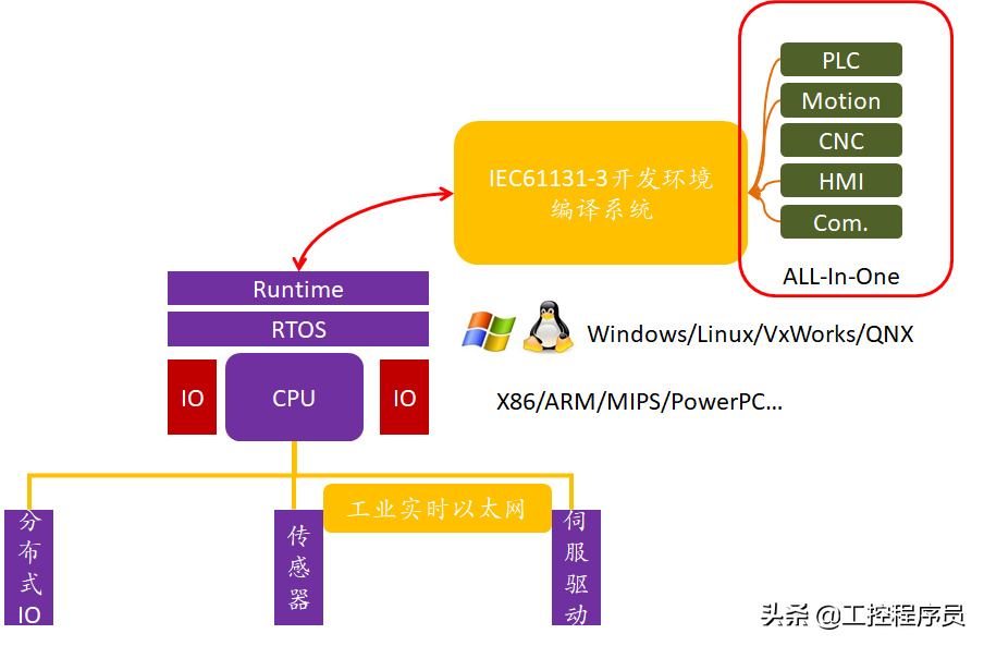 软PLC的基本架构软PLC与传统的PLC(硬PLC)对比,最大的区别是实时操作系统(RTOS)、运行时(RunTime)和编译环境。