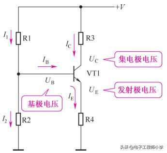 给三极管各电极加上适当的直流电压后,各电极才有直流电流。三极管基极电压用UB表示,UC是集电极电压,UE是发射极电压。