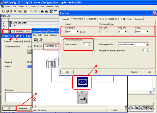 当配置好Modbus通信的参数后,保存前需要向CP341下载ModbusSlave的驱动,一旦下载完成后无需再次下载。