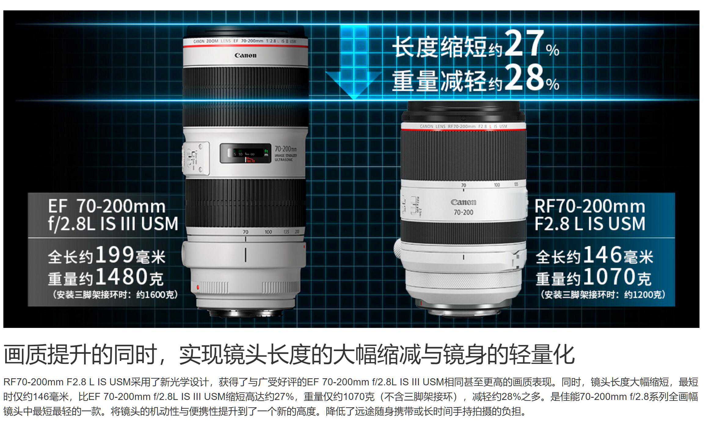 (参考:EF70-200mmf/2.8LIII是1.2米/0.21倍,也就是说别看RF70-200的最近对焦距离近,实际的近摄能力和现在的诸多70-200/2.8镜头基本上是相当的)