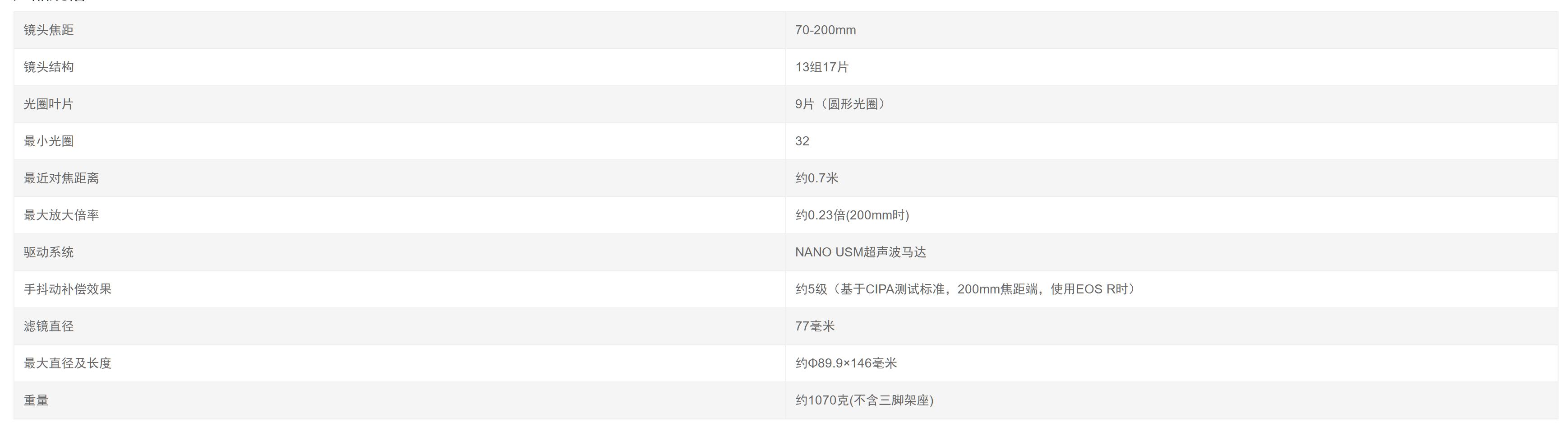 规格表里值得留意的一项是RF70-200的最近对焦距离为0.7m,最大放大倍率为0.23倍,折算下来长焦端近摄时焦距应该有所缩水(按薄透镜模型计算下来才106.5mm,实际镜头前后主面的距离要算进去但估计也不会补偿特别多),可能也是外变焦设计的代价。