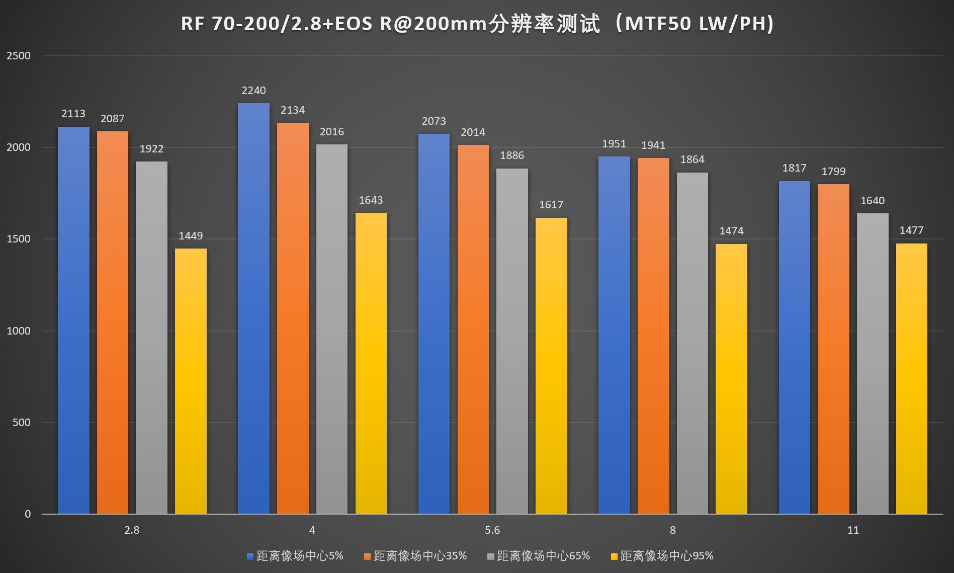 分辨率-焦距分布契合度:高,这支镜头分辨率随焦距的分布比较平均,各个焦距下的分辨率水平都比较接近,相对来说70mm端稍差,中间的100-135mm最好,然后200mm有一点点差距不大的下降。既然选择了长焦镜头那么肯定常用的还是长焦,RF70-200在各个长焦焦段下的表现比较均一稳定。扣一档分数主要还是因为200端不是最佳焦距(虽然确实要做到200端最佳也比较困难)
