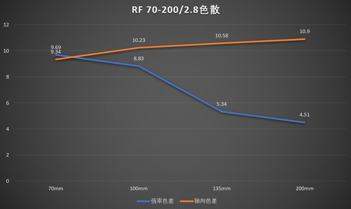 从色散上来看这支镜头也是不太怎么在意70mm端的表现,70mm端的色散相对来说会明显一些,随着焦距增长,控制迅速转好,在长焦端基本看不到可见的倍率色散。