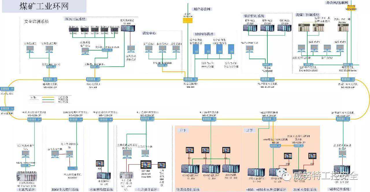 矿井综合自动化系统主要包括(按照功能区域划分):地上系统-安全监测系统、压风制氮系统、锅炉控制系统、洗煤厂控制系统、主通风系统、35KV变配电控制系统、水泵房控制系统、主井提升系统、副井提升系统、网络机房、调度中心等。井下系统-输煤机控制系统、+850、+650水泵房控制系统、采区控制系统等。控制系统以PLC为主,各种类型厂家的均会采用,主要以西门子400、300、200系列、AB小型PLCSLC5/04CPU、ComPactL35E,施耐德PremiuPLC等为主。