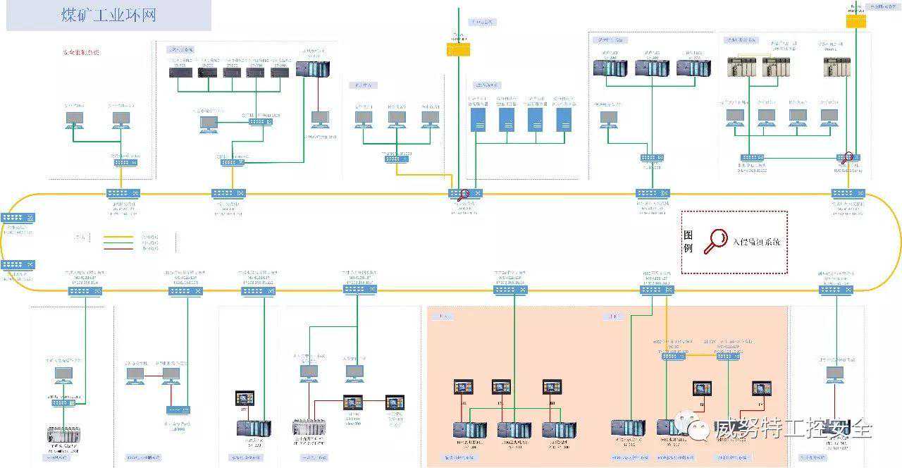 边界入侵检测:对煤矿综合自动化工业环网的网络入侵行为进行检测,确保第一时间发现入侵及恶意行为,保障煤矿综合自动化工业环网的安全。入侵检测系统,在煤矿综合自动化工业环网于办公网连接的入口处,部署入侵监测系统。