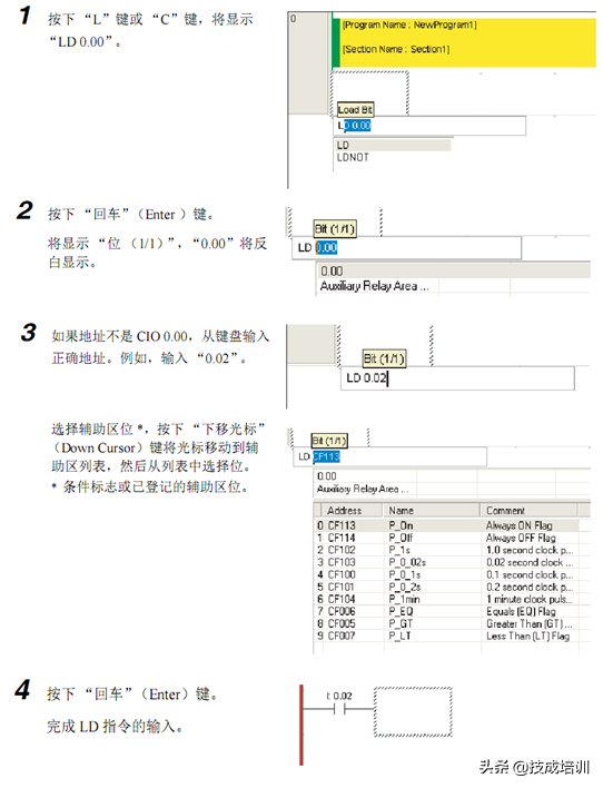 1对于NO输入条件使用LD指令,按下“L”键或“C”键,并选择“LD”。对于OR输入条件,按下“O”键或“W”键,并选择“OR”。