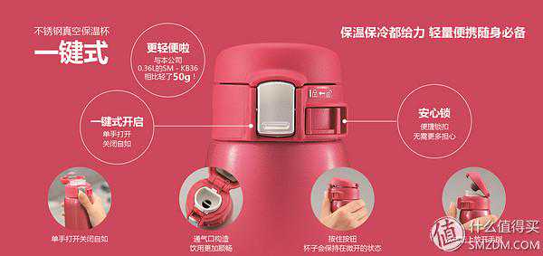 这也是一款非常经典的杯型系列,大妈上口碑和拥有率都很高的一个系列,其中KT是与日亚合作版的代码。SM-K系列属于SLiT超轻巧系列不锈钢保温杯,瓶身体积小,便于携带,可单手饮水。采用304真空不锈钢材质内胆,68摄氏度以上保温6小时,9摄氏度以下保冷6小时,表现足够出色。内胆防沾涂层,可能部分朋友闻涂层色变,其实大可不必。同样采用One-Touch一键开合方便饮用,并且带LOCK锁定按钮,防止意外开启。这款的深可可色杯身哑光金属面设计是小糖比较推崇的,握在手中丝毫没有金属冷冰冰的触感。
