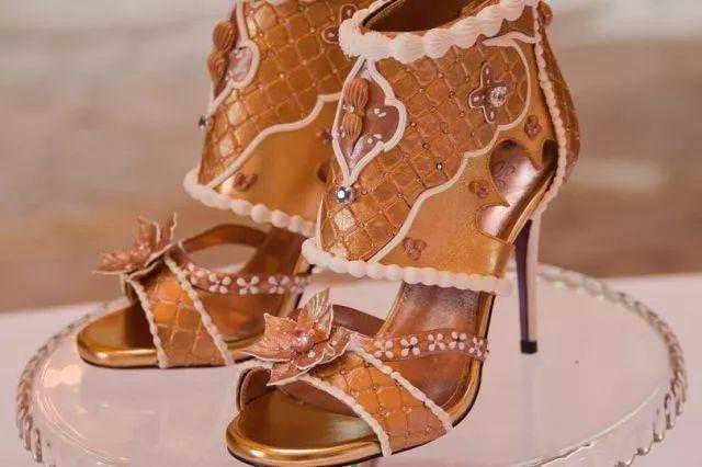 鞋上还有4颗3克拉、无瑕疵的白钻;1000颗小钻石围绕着某些类似裹了糖霜的蛋糕的点缀物。这双手工制作的高跟鞋由24K黄金涂料漆过的皮料制成,并由18K金线缝合而成,耗时数百工时才完成。