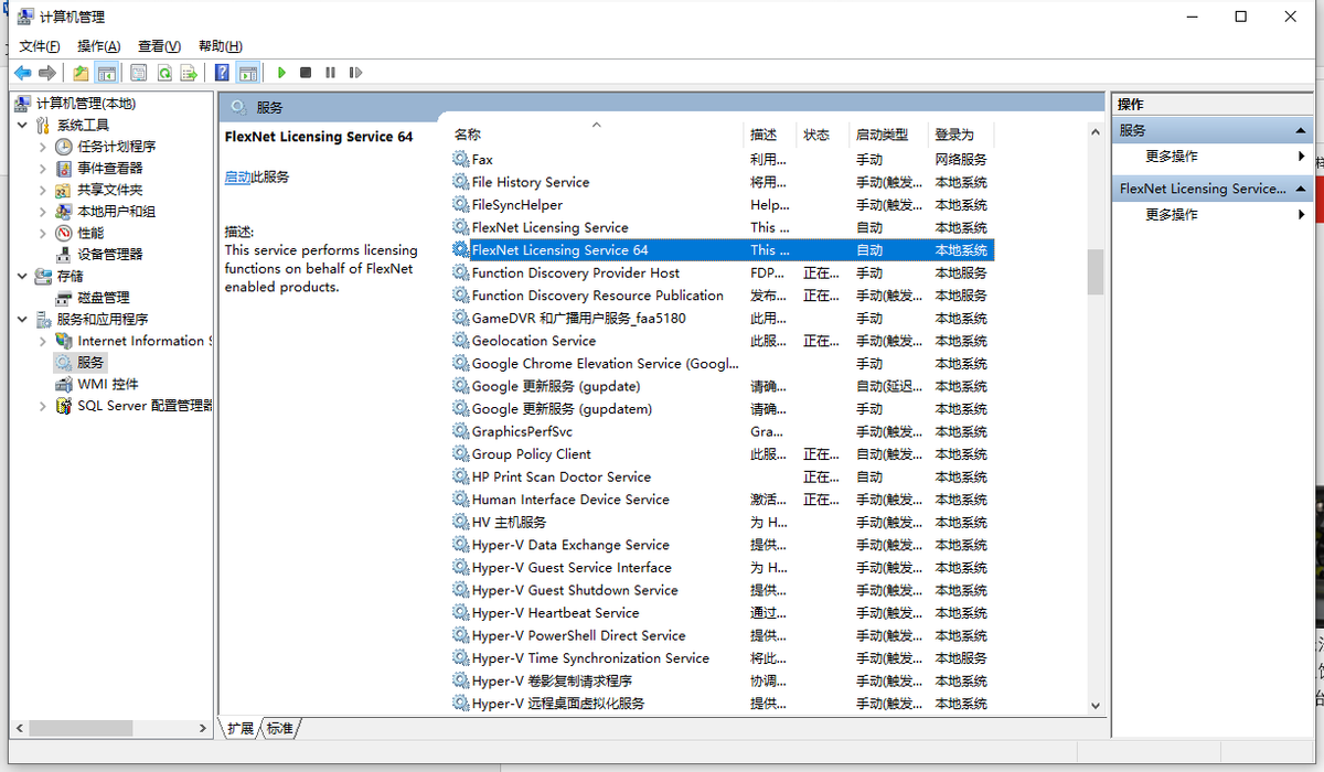 首先,右击我的电脑,在管理中打开服务选项,或者在开始中打开搜索服务,打开系统服务窗口,向下滚动到FlexNetLicensingService和FlexNetLicensingService64。
