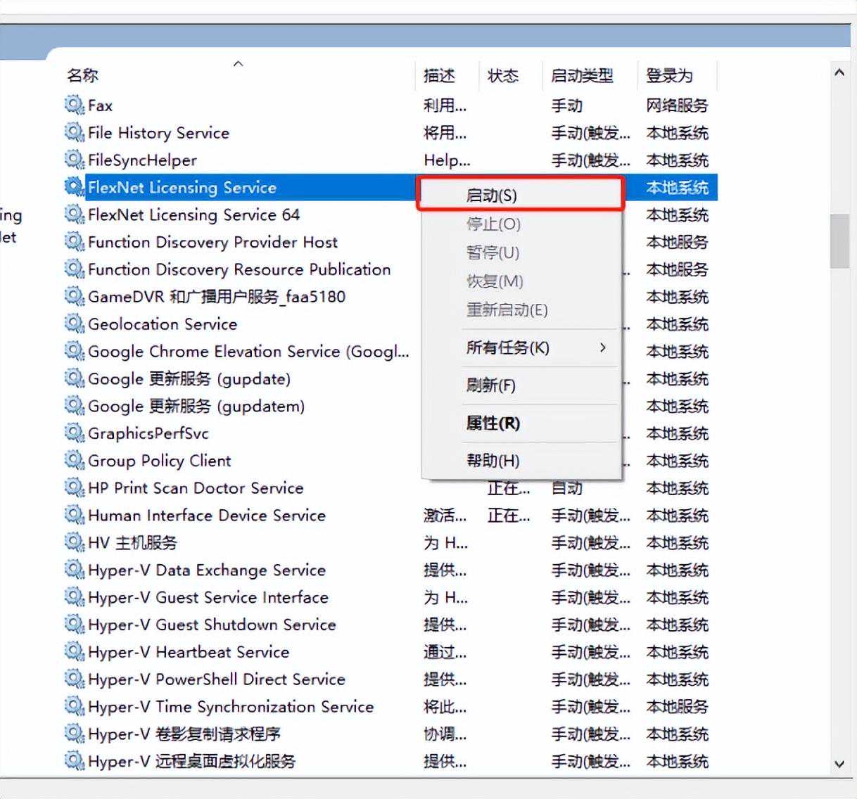 右键单击FlexNetLicensingService,然后单击启动。