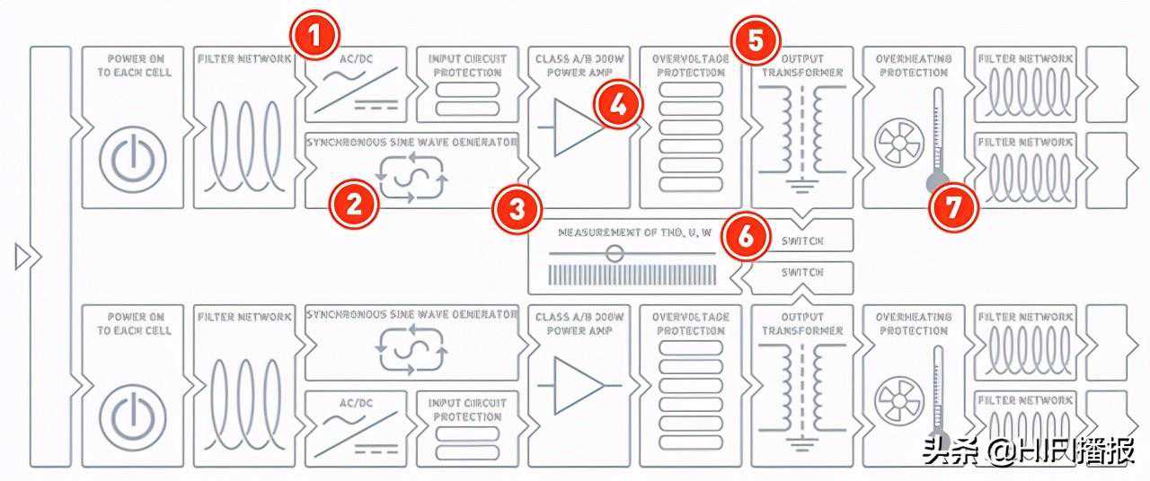 EVO3Genesis的线路图,可看到两个正弦波再生模组,各自经过AB类300W放大后到输出变压器。。