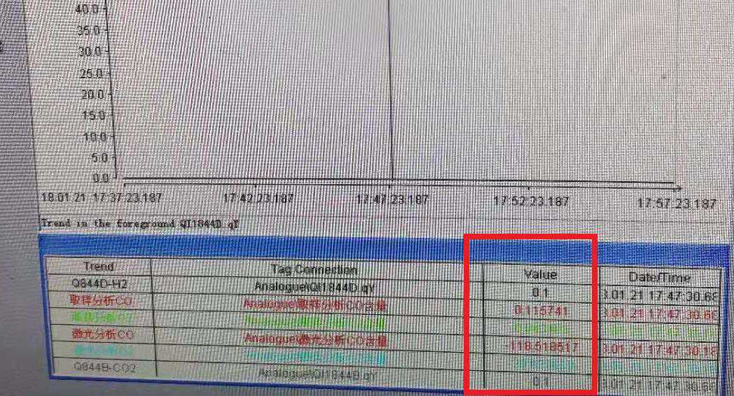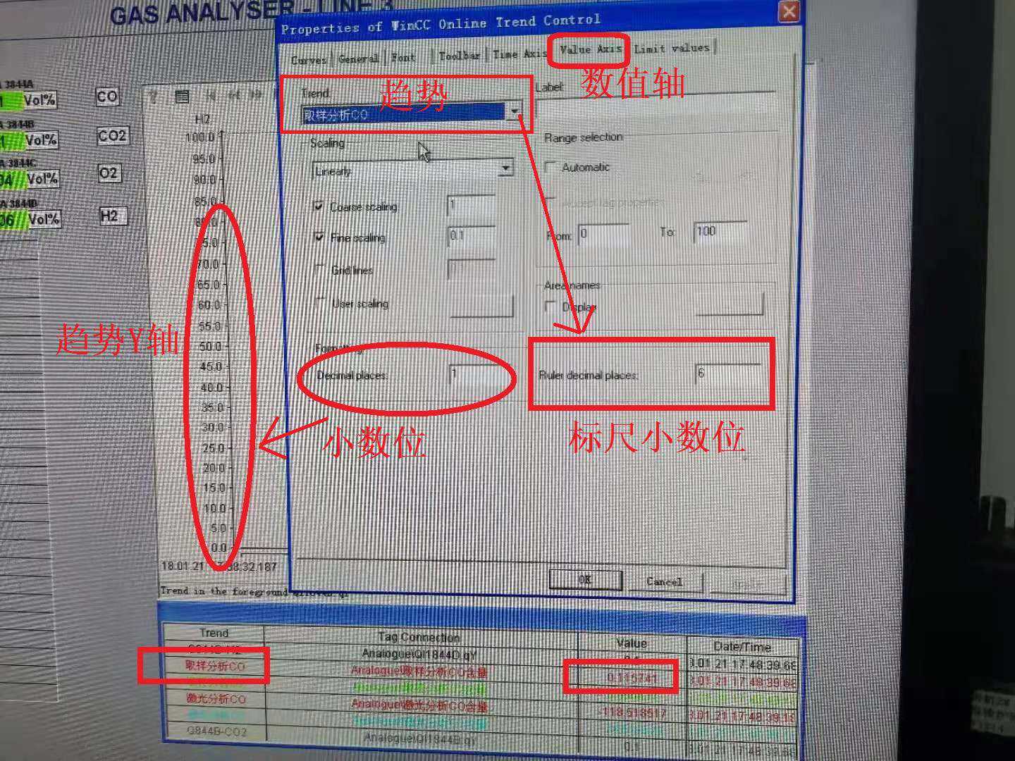 3,需要修改哪里呢?打开组态对话框,在ValueAxis(数值轴)里找到Tr(趋势),在下拉菜单里找到各自的采样点位,分别在Rulerdecimalplaces(标尺小数位)里设置位数即可,我们看图片里趋势选择的是采样分析CO,标尺小数位设置为6,那么小数位在Ruler里就是显示6位小数位。