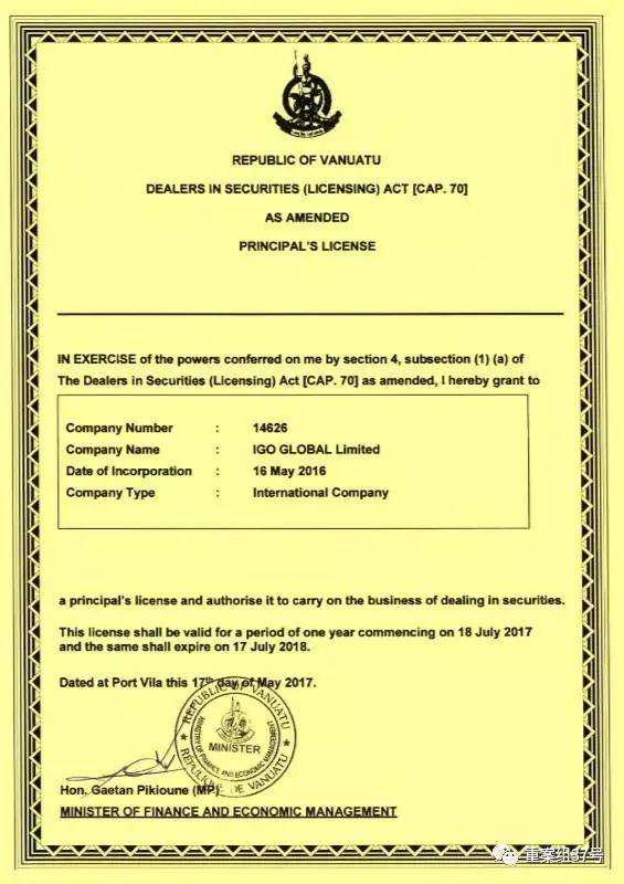 7月21日,新京报记者在IGOFX官网上看到一份电子版本的瓦努阿图监管执照,显示公司名称为IGOGLOBALLimited,成立于2016年5月16日。其条款指出该执照的有效期为1年。