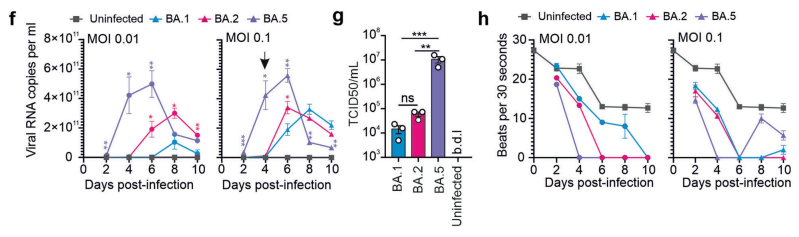 通过对心肌细胞的跳动测量显示,在10天内,未感染的心肌细胞跳动速率从每30秒跳30次稳步下降至10次,而感染原始毒株或Delta的心肌细胞通常在第3-5天完全停止跳动。相比之下,感染的心肌细胞停跳时间有所延迟。