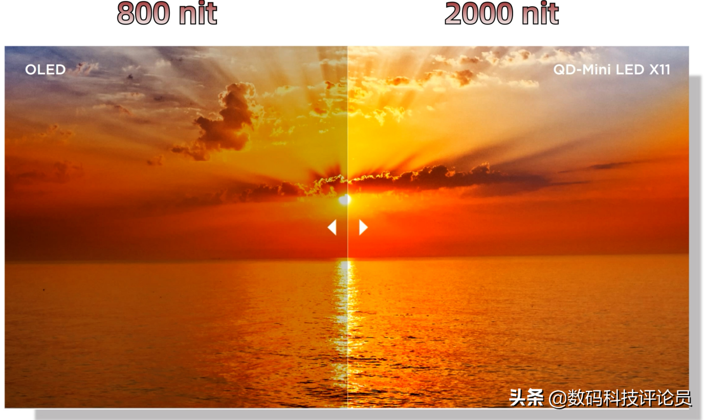 而MiniLED则把是把一整块背光模块,缩小成一颗颗50-200微米之间的LED小灯珠,并且可以单独控制开关,大家可以脑补一下,同样是显示一页内容,一边是一整块背光整体开关,另外一边是像素点单独控制小灯珠开关,很明显MiniLED控光精细程度会比LED电视高得多。