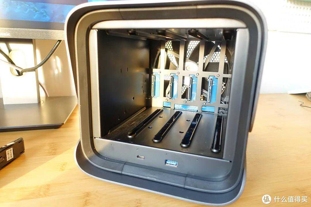 前面板的底部,有一个接口和一个5G速度的Type-C接口。可以明显看到的是,硬盘支架之间的空隙预留的非常充足,基本是我见过成品NAS里最大的了,这样可以促进硬盘之间的空气流动,加强对硬盘的散热效果。