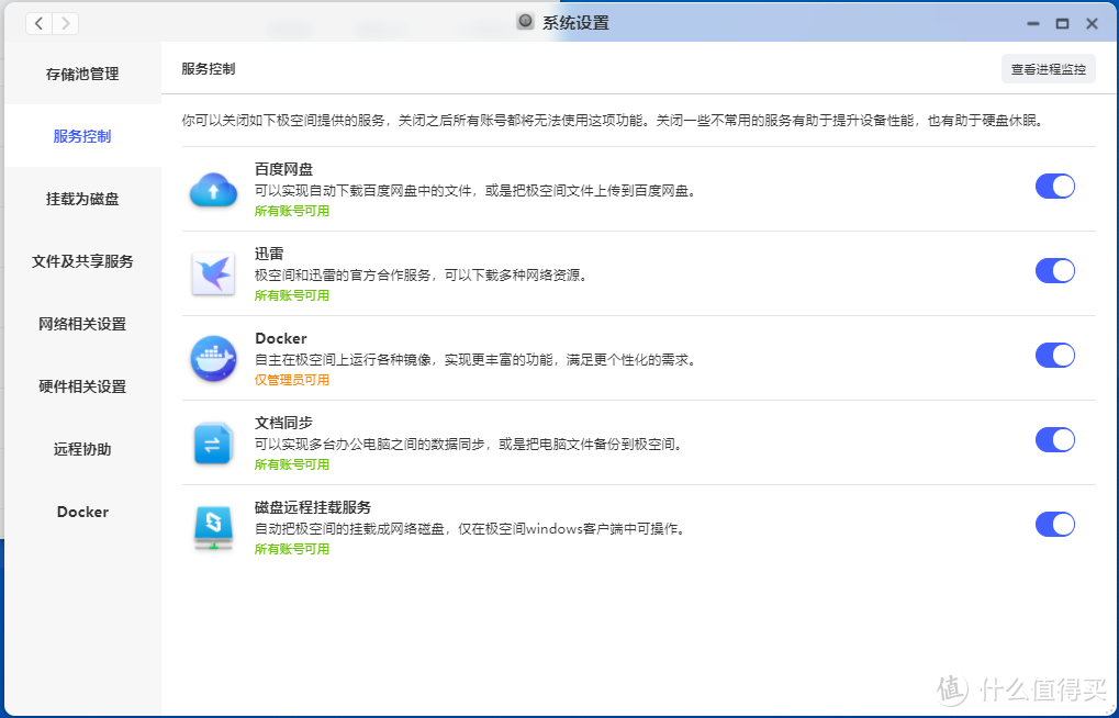 以我自己为例,极空间自带的极影视、极相册和Tr内核的下载功能已经足够我使用了,而我唯一想用的Docker版zerotierone因为无法通过SSH部署安装,所以我这就一个Docker都没装。
