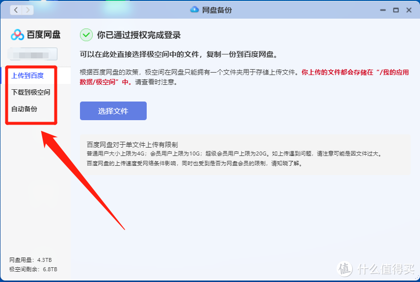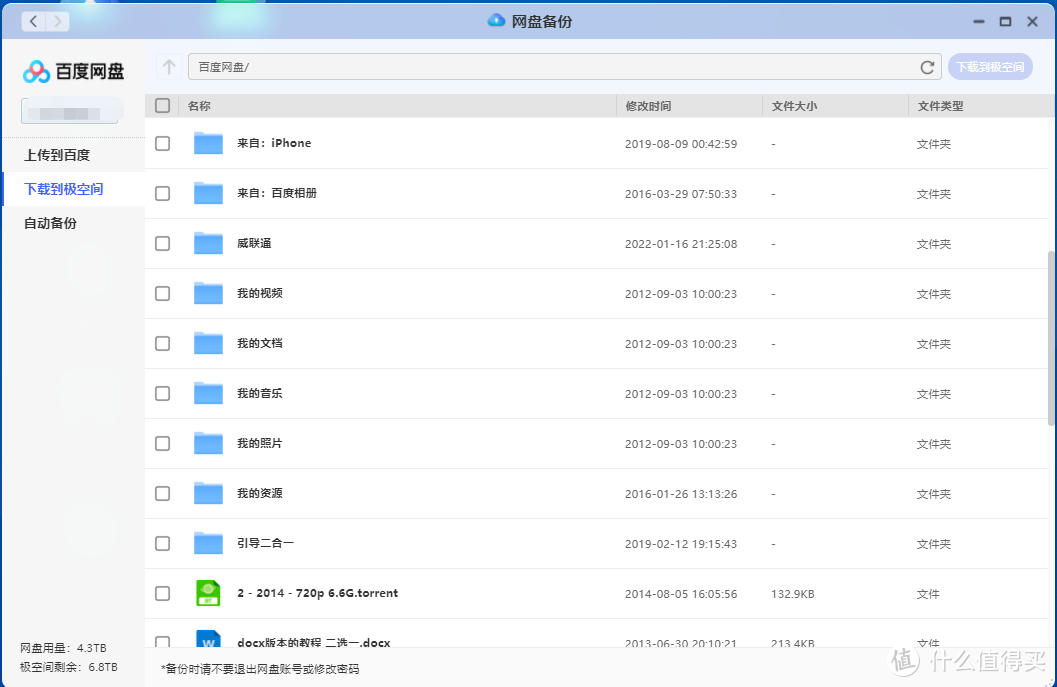 登录百度网盘后,可以选择将极空间的文件上传到百度网盘,或者从百度网盘下载到极空间,亦或者也可以设置自动备份。
