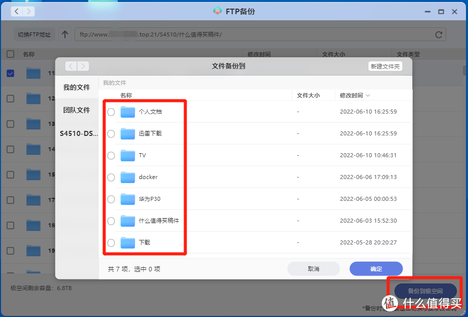 当然,FTP备份这个套件目前只是解决了有和无的问题,在功能性上还是不如群晖的HyperBackup、威联通的HBS3等软件,只能实现从旧NAS到极空间的单向导入,也只支持FTP协议,并且无法设置备份的计划任务。