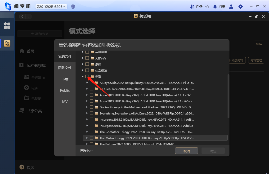 在极影视那边就可以按之前的步骤来添加电影了,添加完成后也是可以自动识别出来海报墙的,我框出来的这三个文件夹都是我威联通里的内容。