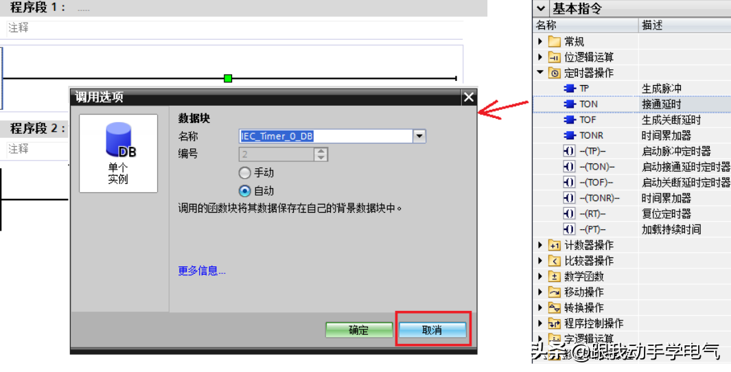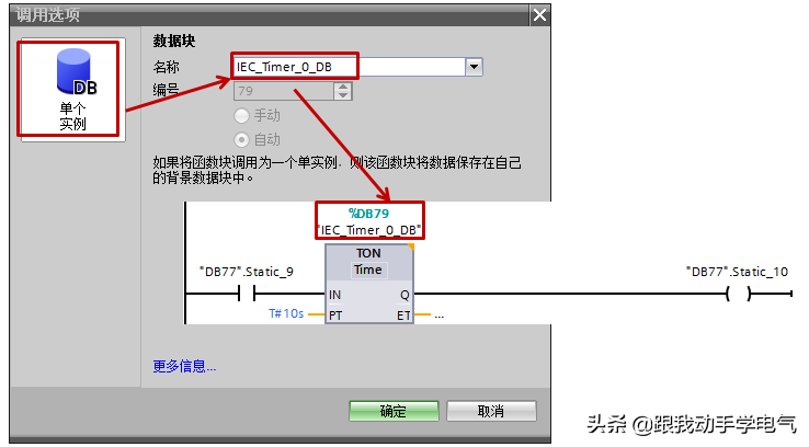 5.在插入DB时,选择IEC_TIMER类型的数据块,将该数据块填在指令上方。此种方法生成的数据块等同于第一种的背景数据块,位于“系统块程序资源”中,从TIA博途V11开始,线圈型指令同样适用,参见图11。