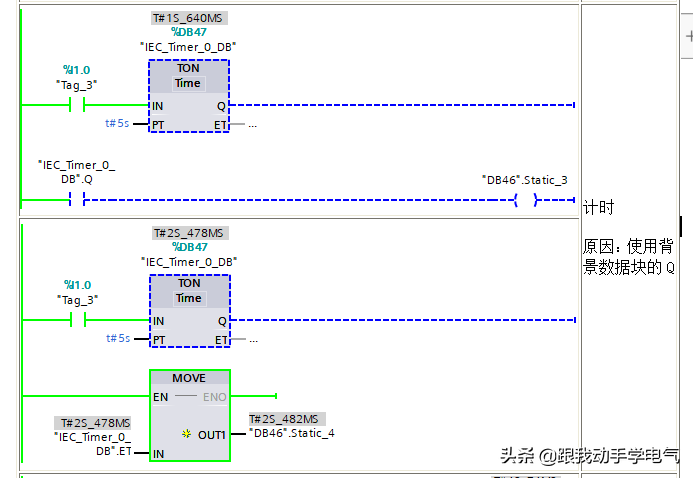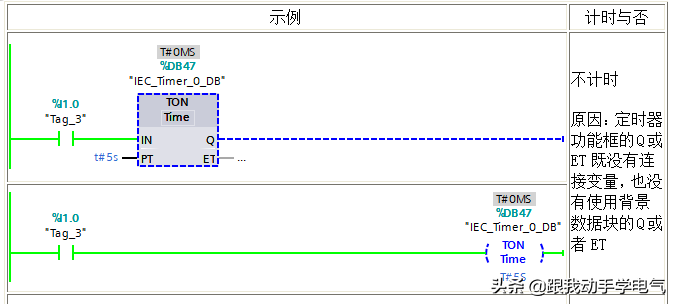 (3)只有在定时器功能框的Q点或ET连接变量,或者在程序中使用背景DB(或IEC_TIMER类型的变量)中的Q点或者ET,定时器才会开始计时,并且更新定时时间。参见下图