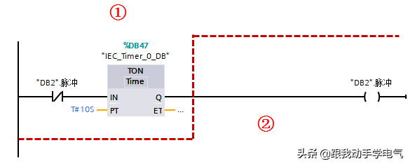 阶段2.当定时时间到发生在①所处的位置,在第一行的"IEC_Timer_0_DB".Q处定时器更新,更新后,"IEC_Timer_0_DB".Q=True,取反为False,此时作为TON的输入,使得定时器复位,第二行的"IEC_Timer_0_DB".Q=False,输出的"DB2".脉冲=False,到下周期时就回到了阶段1;