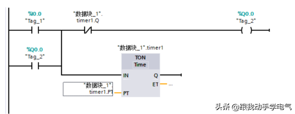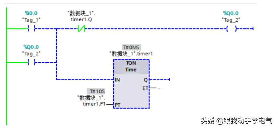 阶段1.初始"DB2".脉冲=False,于是"DB2".脉冲取反为True,触发计时器开始计时,输出的"DB2".脉冲=False,状态不变;定时时间不到,则始终在阶段1;