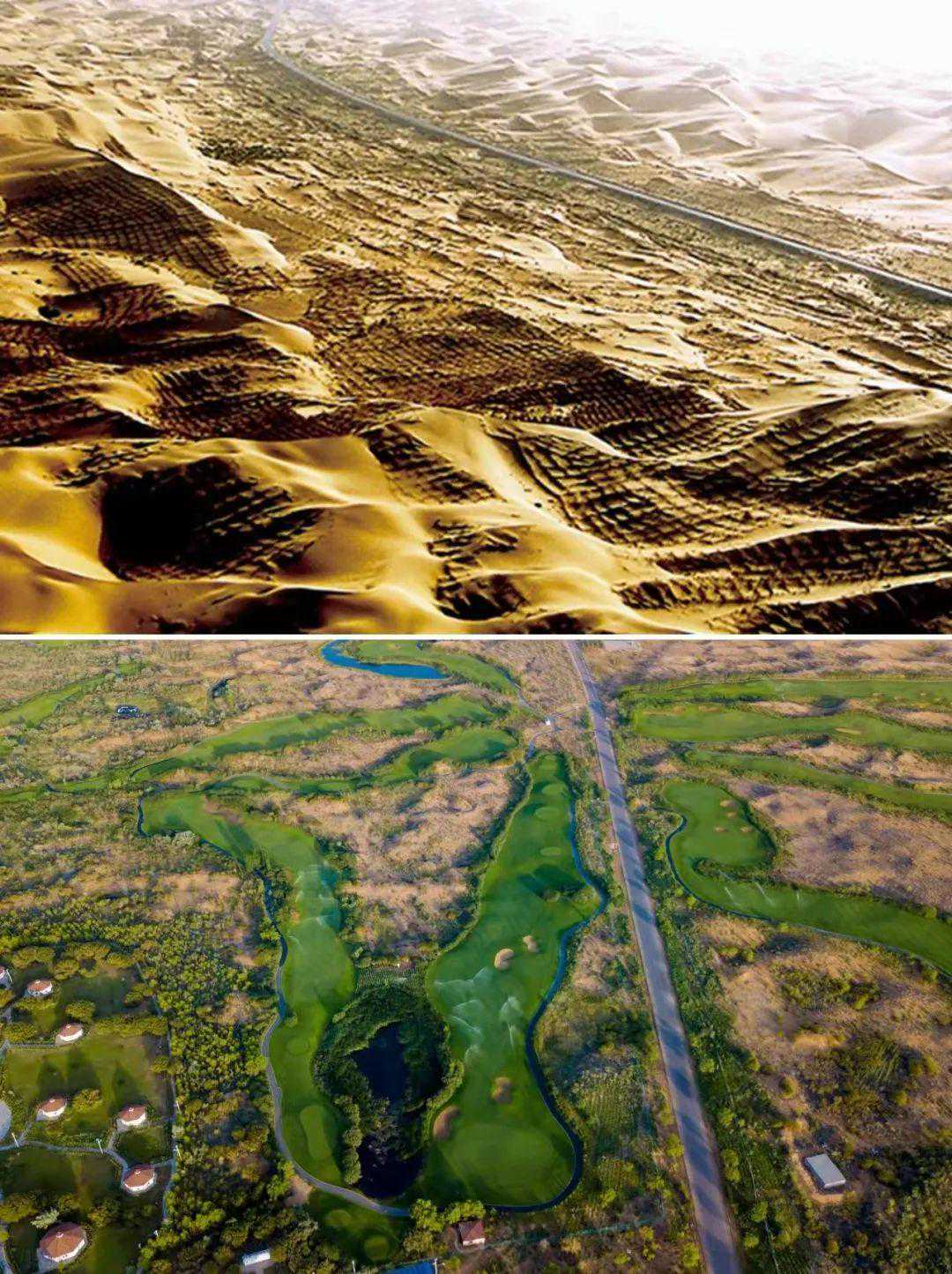 拼版照片:上图为20世纪末的内蒙古鄂尔多斯市杭锦旗库布其沙漠(资料照片);下图为库布其沙漠生态公园的景色(新华社记者彭源2018年7月11日无人机拍摄)