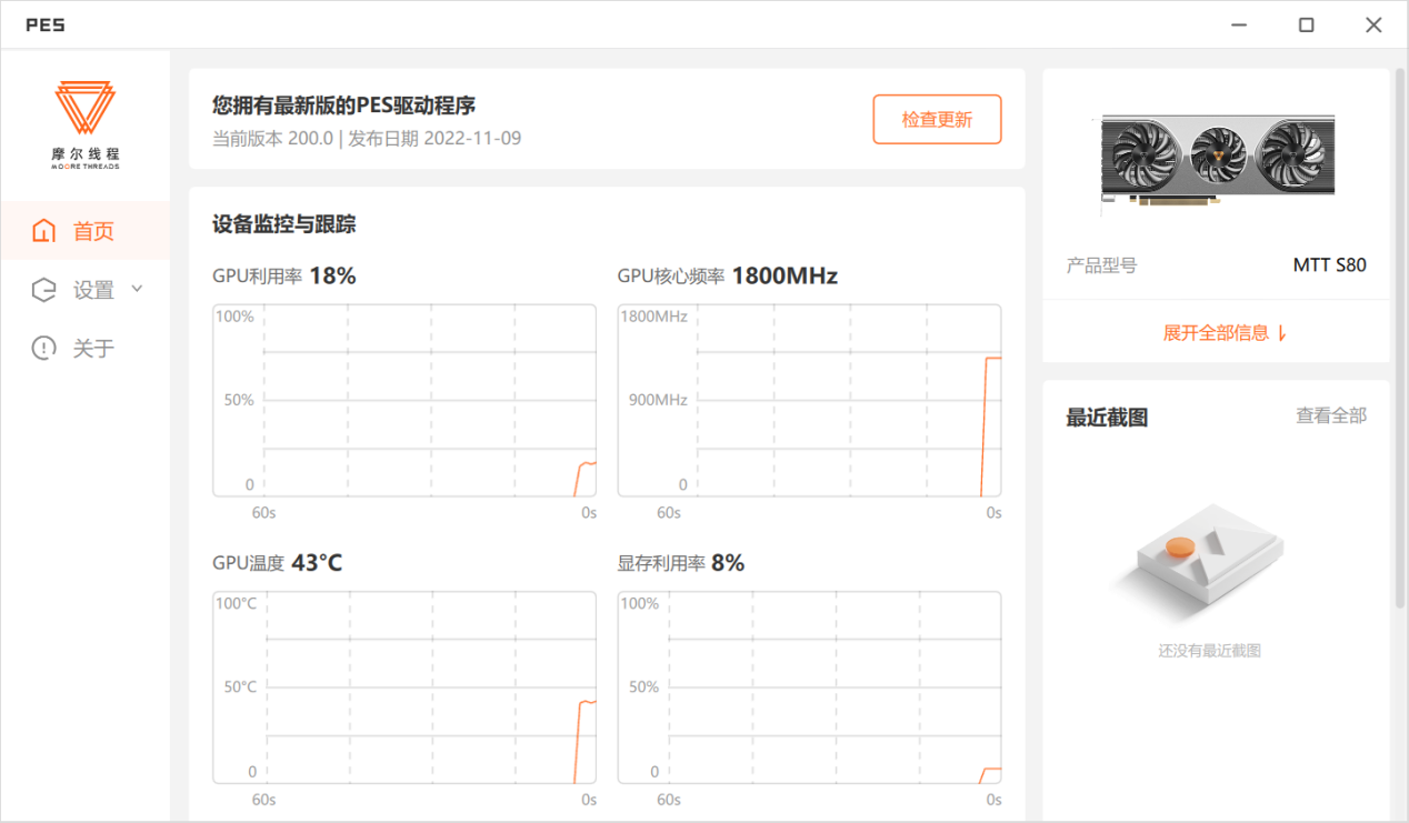 首先我们进行一下理论性能测试。但在测试前,我们发现:MTTS80的确是支持Windows和DirectX环境,在硬件层面能够支持DirectX11,但目前驱动还未完成全部功能模块的开发,因此目前只支持DirectX9,目前大部分的跑分软件都是基于DirectX11/12的。所以常规的测试我们就不能进行了,只能另寻办法。
