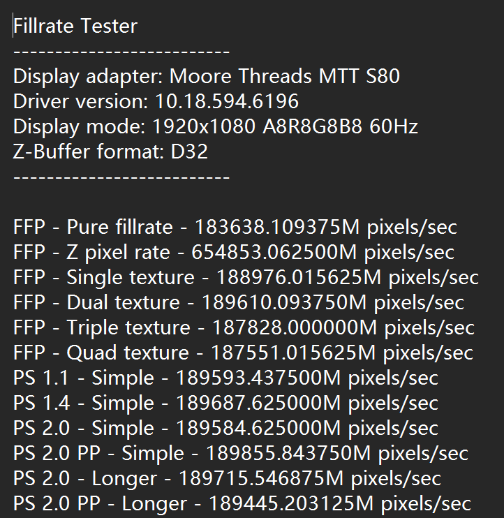 像素填充率和纹理填充率也是评价显卡性能的重要指标。像素填充率指的是GPU在一秒内可以渲染到屏幕并写入显示存储器的像素数量,我们用使用FillrateTester实测MTTS80的像素填充率FFP-Singletexture成绩为188GPixel/s。作为对比,RTX3060的像素填充率为85.30GPixel/s,RTX3080Ti的像素填充率为186.5GPixel/s。