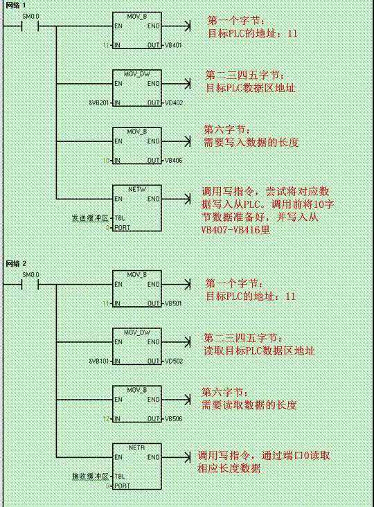 必须根据规定将数据填入缓冲区,数据格式如,如果数据传输缓冲区是VB200,则VB200是状态字,不需要填写,用于读取指令执行的状态。VB201是目标从机的地址,VB202到VB205的时候是从机目标地址,VB206是数据长度,如果是写命令则是你要写的字节数,如果是读命令,你想要的读取数据的长度。VB207是数据区域。对于NETR,在执行NETR指令后,从远程站读取的数据将放在此数据区中。对于NETW,在执行NETW指令之前,要发送到远程站的数据放在该数据区中。