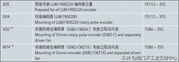订购1LE0电机时,可以通过增加选件来订购需要的编码器,例如1LE0002-0DB22-1AA4–ZZ=X05或G04或X50或W74,通过订货号最后添加-Z来确定该订货号有选件,Z=选件的代码即可。1LE0提供的编码器代码如下图所示。