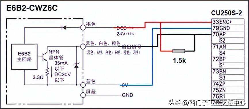 从上图可知,E6B2-CWZ6C编码器为集电极开路NPN编码器,当晶体管截止时,输出信号端状态为OC(开路),如果直接连接西门子变频器的编码器接口,是无法正常工作的,需要接上拉电阻才能正常工作,如下图所示: