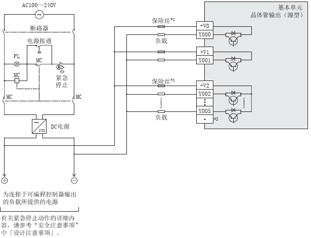 *1、此可编程控制器的输出回路中未内置保险丝。为防止负载短路等原因造成输出元器件损坏、可编程控制器基板接线熔断,请为各负载设置合适的保险丝。