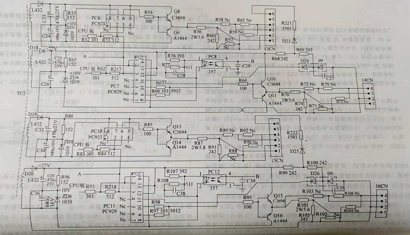 本图为V、W相4只IGBT输出模块的驱动电路。模块的OC故障检测是检测了U、V、W下三臂IGBT的管压降,其OC模块故障由PC4、PC8、PC123路光耦合器接成或门输入方式(3路输出并联),输入到C......