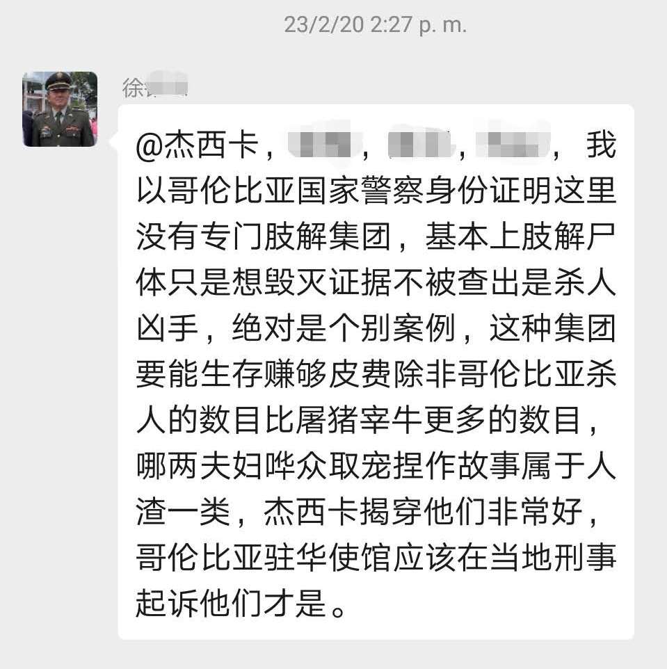 然后把这些报道翻译成西班牙语,给不了解中国的哥伦比亚人讲:“你们以为中国很安全?大错特错!看看,中国肢解尸体案、连环杀人案等多得不得了,只是你们不懂中文,不了解而已!”