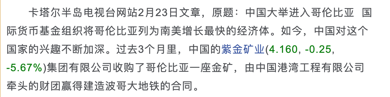 前几天卡塔尔半岛电视台报道:“中国大举进入哥伦比亚,4年内在哥伦比亚的中资企业增多了3倍,从20家增加到80余家。过去3个月里,中国的紫金矿业集团(花10亿美金)收购了哥伦比亚一座金矿,由中国港湾工程有限公司牵头的财团赢得建造波哥大地铁的合同。”