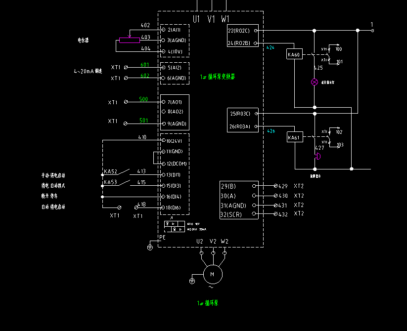 KA53常开触点接通后,变频器进入自动模式,线号418和410连接的线通过PLC或者控制器所控制的继电器的常开触点连接,接通后变频器得电启动。线号601/602连接控制器的4~20mA模拟量信号,变频器根据模拟量信号的数值调节电机频率变化。