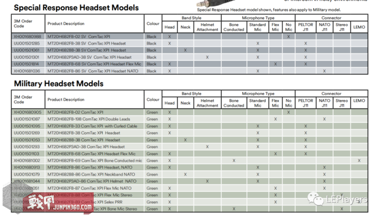 通过上图,可以看出XPI型号的宽泛,不同的接线(北约,peltor,SELEX和STEREO),不同的佩戴(脖/头),目前3M英国官网可查询的XPI为7种。(附:各国3M官网型号有出入,较为混乱,以下型号出自3M[英国],仅供参考)