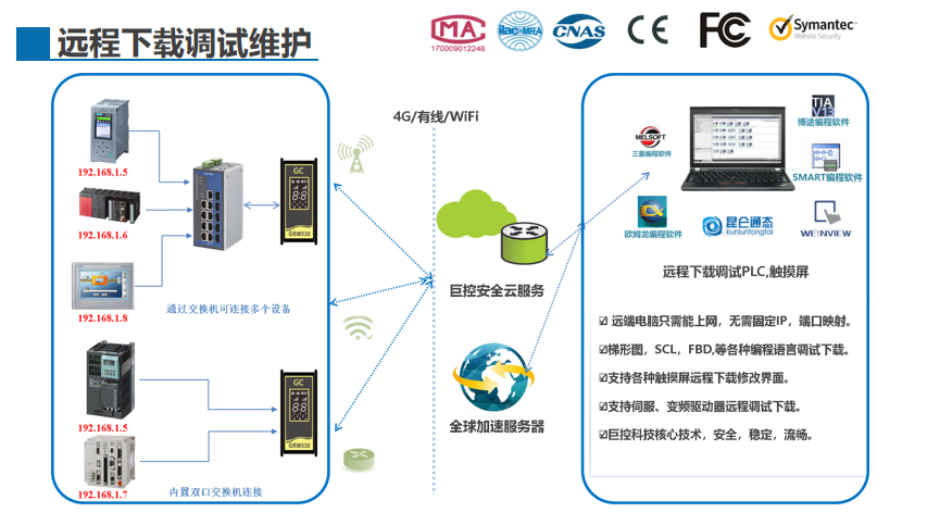 不仅可以流畅的下载调试各种主流PLC(西门子,三菱,欧姆龙,AB,施耐德,台达等),即使对于文件比较大的触摸屏工程(步科,威纶,昆仑,西门子触屏,南大傲拓触屏,,三菱GS系列触摸屏,Proface触摸屏),要求响应速度的运动控制器,伺服(西门子G120变频器安川运动控制器),巨控模块依然可以轻松应对,流畅下载,遥遥领先的技术得益于巨控科技多年来投入大量精力和设备实际测试和积累。