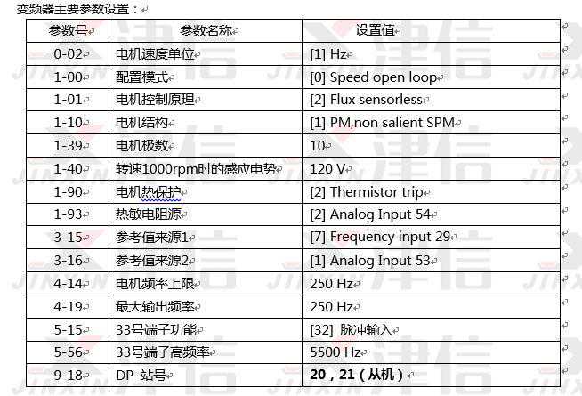 另一台变频器做从机,采用丹佛斯特有的脉冲主从控制方式,跟随主机输出。实践证明此种控制方式成立,两台电机转速同步性非常好,转速只有很小的误差。唯一的缺点是从机的报警状态无法被系统检测到。