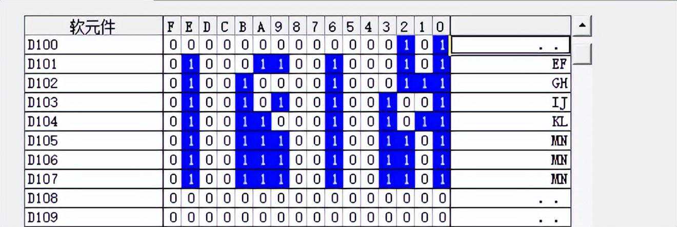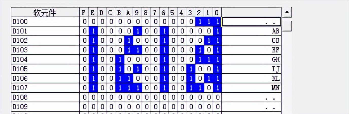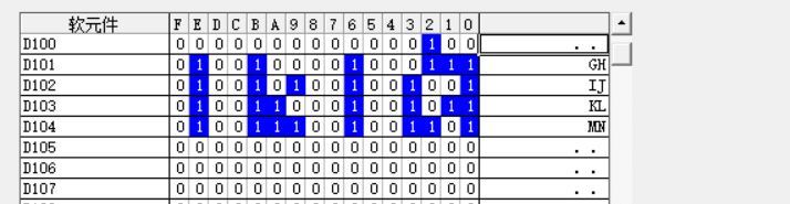 每次读取一个数据,后边的空出的寄存器会被最后一个寄存器D107(“MN”)的内容依次填充,都读取完成后,最后发现D101~D107中都会变成D107中的("MN"),如图5所示