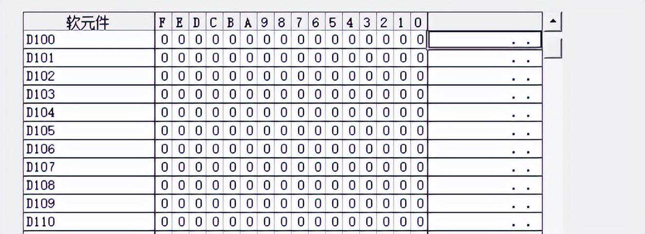 通过依次点动M100,M101,M102,M103,M104,M105,分别将"ABCDEFGHIJKLMN"传送至队列,结果如图3所示。SFWRP是先入先出写入数据的指令,通过SFWRP指令,字符串被依次写入D101~D107中,一共占用7个寄存器,加上D100(存储队列中的数量),一共是需要8个寄存器,所以[SFWRPD0D100K8]中的K8指的是分配8个寄存器。