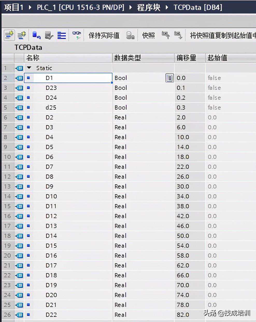 通信地址是有效地址,这句话该怎么去理解呢?因为PLC大多数是基于存储区的,每个地址肯定是隶属于某个存储区,大家都知道西门子PLC自带的存储区有I区、Q区、M区、T区、C区,但是对于常用的DB存储区是没有的,需要自己去创建,也就意味着,如果你要读取DB地址,必须要提前创建好DB存储区,除此以外,DB存储区创建之后,默认是没有字节的,需要自己一个个添加变量,才能形成有效存储区,因此一个DB存储区的范围是有限并且可见的(可以通过偏移量看出来)。举例说明,下图是一个DB存储区,说明这个存储区有86个字节,如果你通信的地址超过这个范围,肯定就会出问题。这点其实也很容易理解,我们把与PLC通信当做从服务器拿东西,如果我们要拿的东西,服务器都没有,那么是不是会出问题呢?