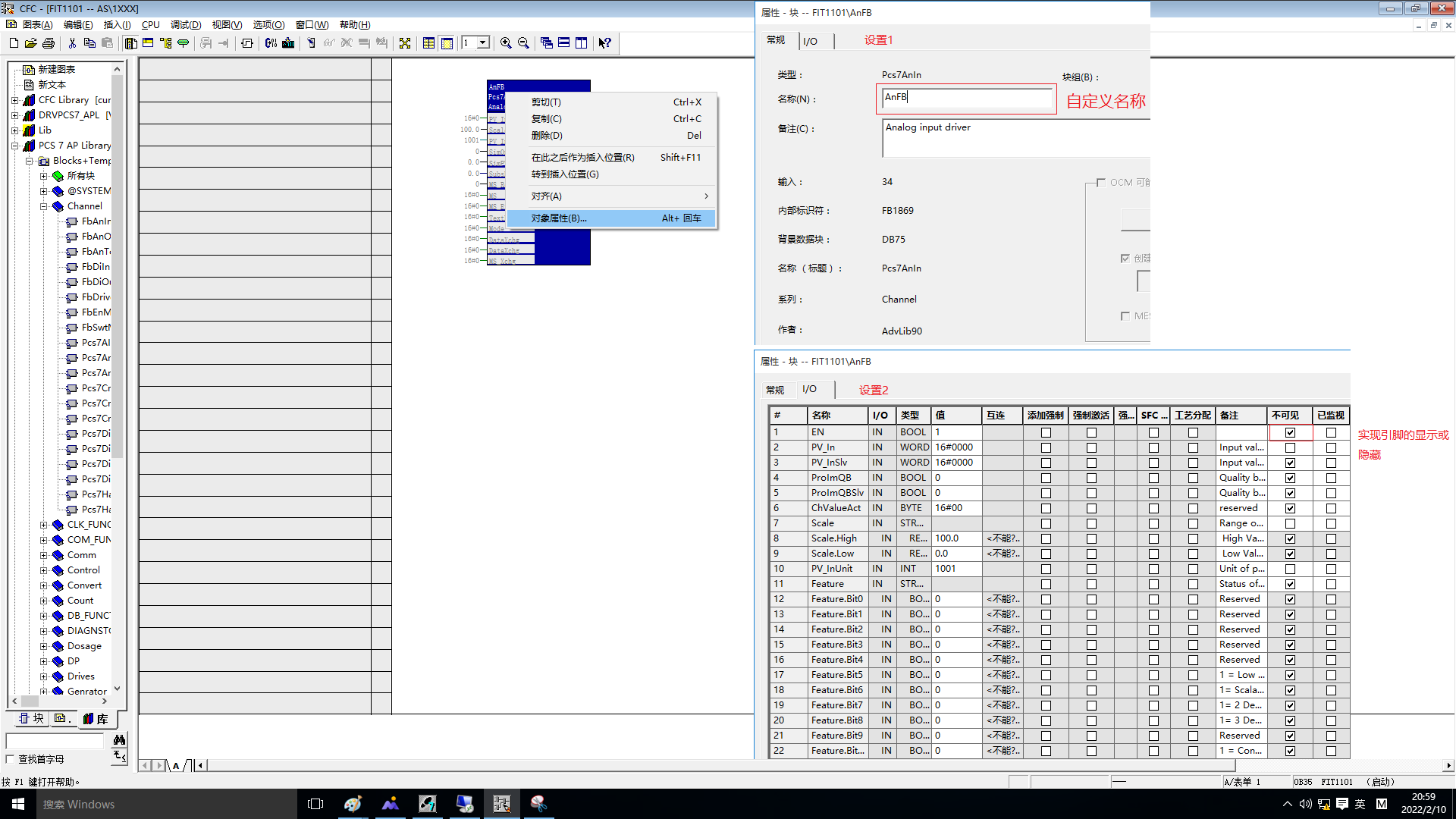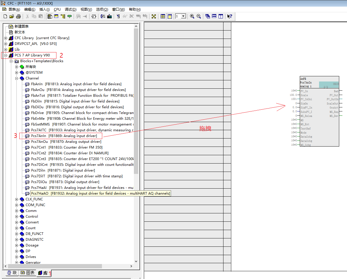 (1)Channel(模块通道驱动块):Pcs7AnIn(FB1869),Pcs7AnOu(FB1870),Pcs7DiIn(FB1871),Pcs7DiOu(FB1873)
