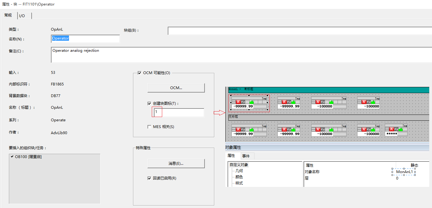 在实际应用中,MonAnL对应的控制面板会比较大(控制面板的功能很多,第一次使用建议尝试使用),占控制画面的空间,因此会取消勾选块属性中“创建块图标”,用一个IO域连接.SP_Int变量就能实现数值的输入。