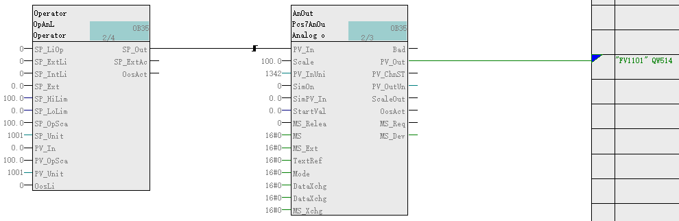 典型应用:控制调节阀,也可连接许可、连锁、保护条件,实现连锁控制。MV_Ext引脚连接PID输出引脚可实现,阀门的调节控制。