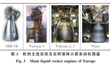 欧洲在欧盟的政治框架下坚持航天独立自主、技术继承的发展路线,目前在役和在研的仅4个型号。1975年,欧空局开始研制Ariane运载火箭,其三子级采用氢氧发动机HM-7,采用燃气发生器循环系统。HM-7发动机用于Ariane1火箭后,逐渐改进,通过提高室压、加大喷管面积比等手段挖潜,发展为HM-7B发动机,推力10t级。HM-7B用于Ariane2、3、4和增强型Ariane5E火箭的末级ESC-A。欧洲主流在役及在研液体火箭发动机及主要性能参数见图3、表3。