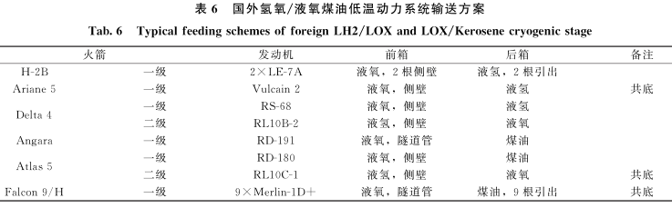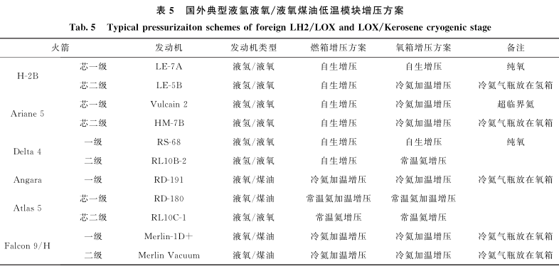 国外主流液氢液氧和液氧煤油低温动力系统增压方案和输送方案分别如表5、表6所示。液氢、液氧优选自生增压方案,系统简洁,成本低廉,可靠性高;煤油、含杂质液氧等不具备自生增压条件的推进剂,以及涉及长时间在轨滑行的模块优选氦增压方案,可充分利用氦气密度低且安全性好、与推进剂不相溶的特点;对于氦需求量较大的模块优选将氦气瓶内置在低温贮箱内部,通过降低温度的方式提高贮存率。